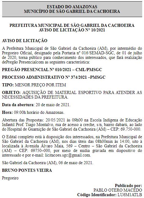 De acordo com o órgão, as denúncias foram feitas por parlamentares de São Gabriel da Cachoeira. O inquérito civil apura uma suposta fraude no Pregão Presencial nº 010/2021, publicado pela prefeitura do município no Diário Oficial Eletrônico, em 9 de maio deste ano, que tinha como objetivo a “aquisição de material esportivo para atender as necessidades da prefeitura”.
