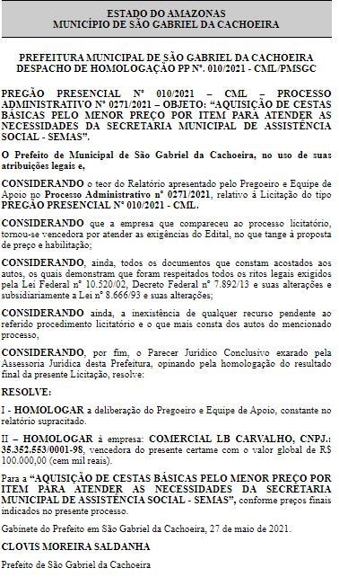 Porém, no documento da homologação do pregão, publicado no último dia 18 de junho, o objetivo foi alterado para “aquisição de cestas básicas pelo menor preço por item para atender as necessidades da Secretaria Municipal de Assistência Social (Semas)”, que definiu a empresa LB de Carvalho Eireli – que fornece combustível ao município – como vencedora do processo de licitação. Conforme decisão do MPAM, o inquérito também avalia a escolha do pregão presencial, em vez do pregão eletrônico.