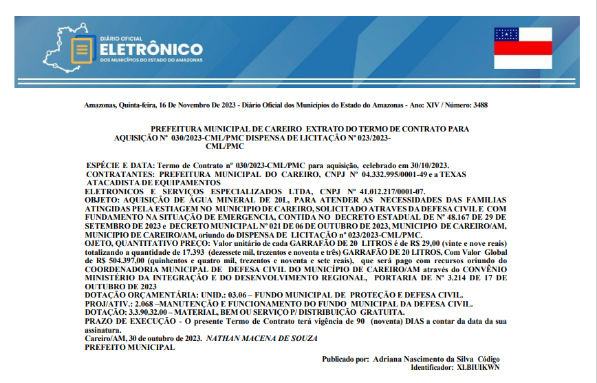 MANAUS (AM) – A Prefeitura do Careiro, no interior do Amazonas, município distante 124 km de Manaus, vai comprar 17.393 galões de água de 20 litros no valor de R$ 504.397. O extrato da compra é assinado pelo prefeito do município, Nathan Macena de Souza (Republicanos), e foi publicado no Diário Oficial Eletrônico Dos Municípios do Estado do Amazonas nesta quinta-feira, 16.