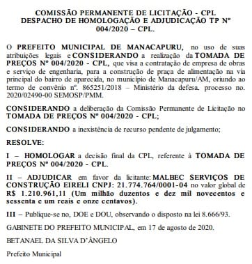 A empresa vencedora da licitação foi a Malbec Serviços de Construção Eireli, que ficará responsável pela construção de uma praça de alimentação na via principal do bairro de Aparecida, em Manacapuru. O contrato é oriundo do termo de contrato nº 865251/2018, do Ministério da Defesa.