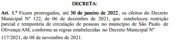 De acordo com a medida, publicada no Diário Oficial dos Municípios (DOM), a prorrogação do decreto ocorre por conta do aumento de casos da Covid-19 observados nos últimos boletins da Secretaria Municipal de Saúde de São Paulo de Olivença e atende a avaliação de indicadores epidemiológicos, de assistência à saúde e de vacinação da população no Amazonas.