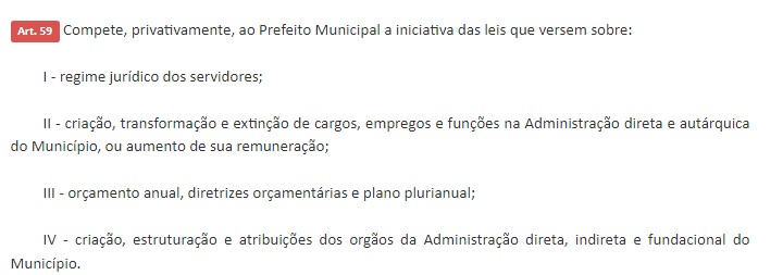 “I – regime jurídico dos servidores; II – criação, transformação e extinção de cargos, empregos e funções na Administração direta e autárquica do Município, ou aumento de sua remuneração; III – orçamento anual, diretrizes orçamentárias e plano plurianual; IV – criação, estruturação e atribuições dos orgãos da Administração direta, indireta e fundacional do Município”, trecho da Loman.