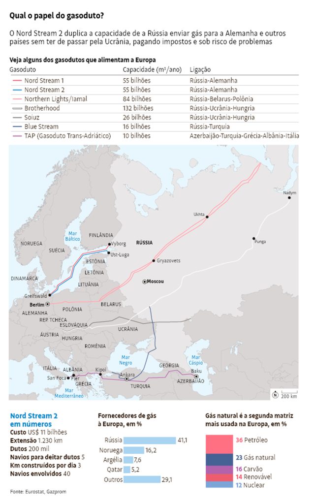 Em setembro passado, foi completado o gasoduto Nord Stream 2, que irá duplicar a quantidade de gás enviado diretamente da Rússia para os alemães, tirando assim rendimentos do trânsito feito por meio de antigas rotas soviéticas pela Ucrânia — anualmente, Kiev tira algo como US$ 2 bilhões desse pedágio. Berlim adiou o início de sua operação alegando detalhes burocráticos.