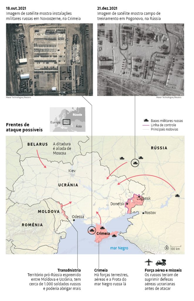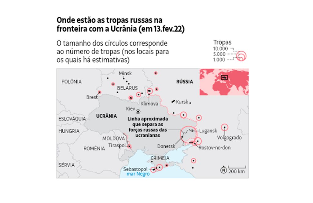 O Ocidente rejeitou a ideia. Desde a semana passada, os Estados Unidos lideram uma onda alarmista, citando até a data de quarta-feira (16) como a de uma invasão, que chama de “iminente”, desde o começo do ano. Na segunda-feira (14), imagens de satélite da empresa americana Maxar sugeriram o envio de mais tropas, no fim de semana, talvez totalizando 150 mil soldados.