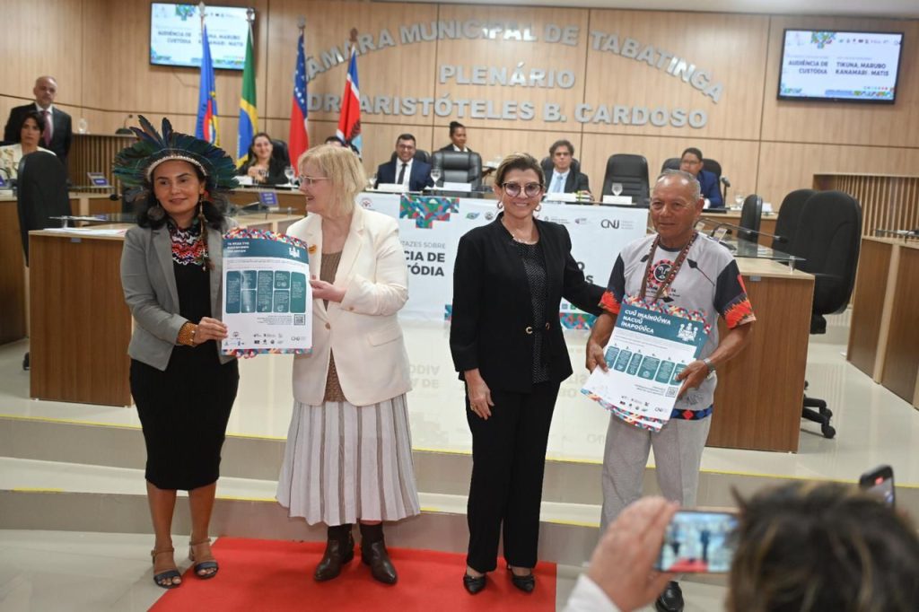 “A riqueza moderna é baseada em capital humano, em conhecimento, educação e garantia de direitos. Somos grandes na medida em que nossos povos originários são respeitados e têm sua dignidade reconhecida e garantida por todos os meios possíveis. Cada medida, cada projeto e cada programa que venha atender a esses objetivos deve ser acolhido com muito comprometimento e zelo. Desse modo, é com imensa satisfação que estamos presentes aqui, hoje, para ampliar este importante projeto e lançar os Cartazes informativos sobre audiência de custódia traduzidos nas línguas indígenas Tikuna, Marubo, Matis e Kanamari no município de Tabatinga. Uma iniciativa do Conselho Nacional de Justiça, por meio do Programa “Fazendo Justiça”, que conta com o total apoio do Tribunal de Justiça do Estado do Amazonas, da Escola Superior da Magistratura do Amazonas, do Grupo de Monitoramento e Fiscalização do Sistema Carcerário e do Socioeducativo (GMF) e da Coordenação de Audiência de Custódia”, afirmou a desembargadora Nélia Caminha Jorge.