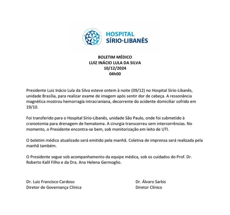 Segundo o boletim médico, o presidente Lula foi atendido na unidade de Brasília do Hospital Sírio-Libanês na noite de segunda-feira, após relatar dor de cabeça. Exames de imagem, incluindo uma ressonância magnética, indicaram hemorragia intracraniana, consequência de um acidente ocorrido em 19 de outubro, quando o presidente sofreu uma queda no Palácio da Alvorada. Após o diagnóstico, Lula foi transferido para São Paulo, onde foi submetido ao procedimento cirúrgico.