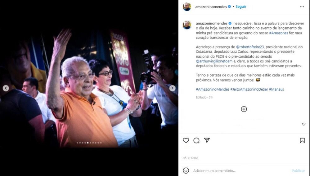 Amazonino também publicou uma série de fotos do evento e chegou a republicar stories de apoiadores que estavam no local acompanhando o lançamento. Em nenhum dos trechos publicados ele faz menção direta à presença de José Melo. O pré-candidato postou texto agradecendo a presença de Roberto Freire, presidente nacional do Cidadania, do deputado Luiz Carlos, representando o presidente nacional do PSDB e do pré-candidato ao senado Arthur Virgílio Neto.