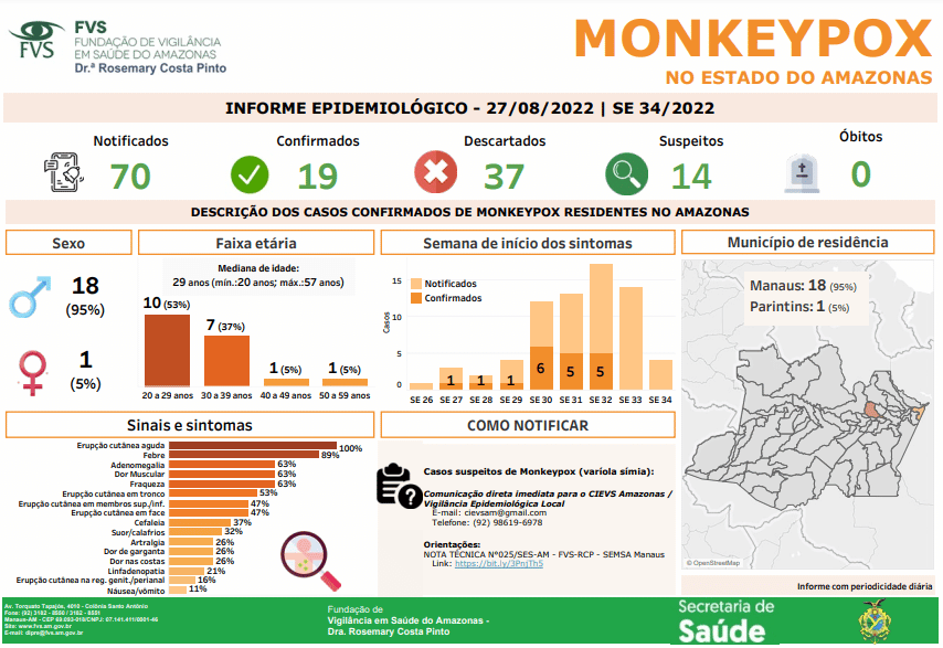 Neste informe, há a inclusão de cinco novas notificações no município de Manaus. O atual cenário do Amazonas é de 70 notificações, sendo 19 confirmados, 37 descartados e 14 suspeitos, sem registro de óbito da doença. A FVS-RCP destaca que toda a rede de saúde, incluindo unidades privadas e públicas, da capital e interior, está orientada para realizar atendimento de casos suspeitos de Monkeypox.