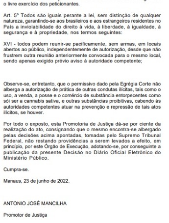 Na última quinta-feira, 23, um portaria publicada no diário eletrônico do Ministério Público do Amazonas (MPAM) defendeu que a Marcha da Maconha em Manaus está protegida por decisões do Supremo Tribunal Federal (STF). O órgão, no entanto, destacou que a Corte não acata a autorização de práticas ilícitas, como o uso, a venda, a posse e o comércio de drogas durante o ato.