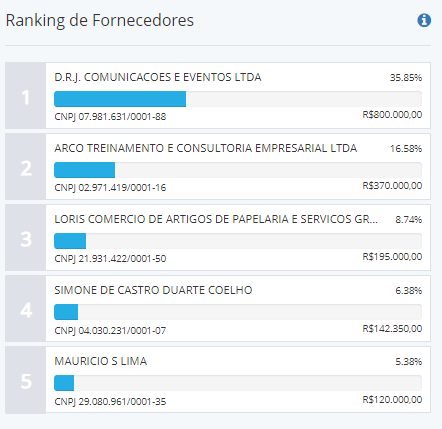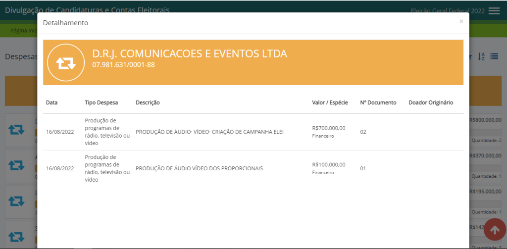 A empresa investigada aparece em primeiro lugar no ranking de gastos do candidato do Cidadania. O valor destinado apenas a D.R.J. Comunicações e Eventos Ltda. (R$ 800 mil) chega a ser quase a mesma soma de todos os outros quatro fornecedores que aparecem abaixo no ranking (R$ 827 mil), conforme tabela abaixo: