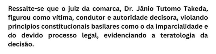 O procedimento de prisão do delegado é contestado pelo Sindepol-AM, que afirma ser “inexistente no Direito brasileiro” e diz que o juiz da comarca figurar como vítima, condutor e autoridade no caso, violaria “princípios constitucionais basilares como o da imparcialidade e do devido processo legal”, o que mostra a “teratologia da decisão”, termo usado no meio jurídico para apontar uma decisão absurda.