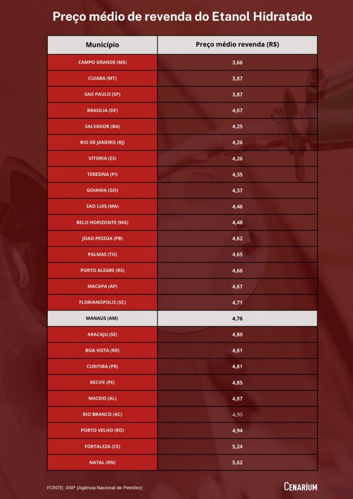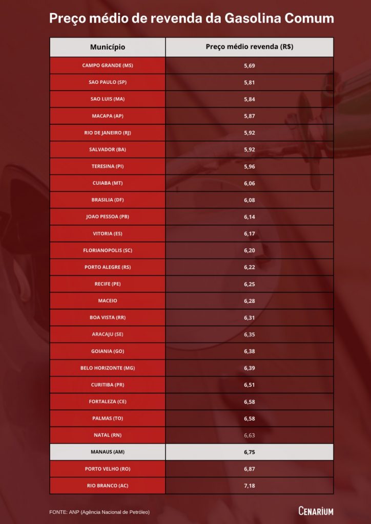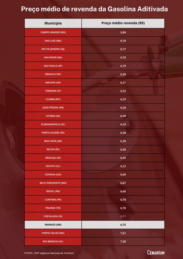 No etanol hidratado, Manaus está entre as dez capitais com os maiores preços, com um preço médio de revenda de R$ 4,76. Quanto à gasolina aditivada, a cidade está no “top 3” das mais caras, com um preço médio de revenda de R$ 6,75. A capital amazonense ocupa a mesma posição em relação à gasolina comum, com o mesmo preço médio de revenda.