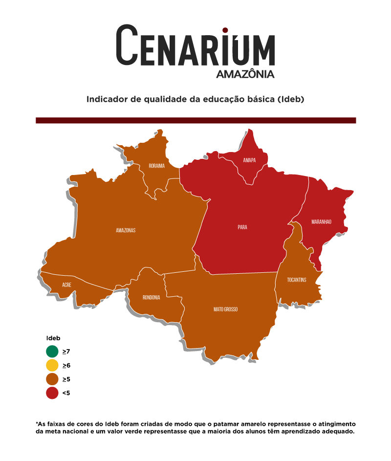 De acordo com os dados do QEdu, os nove Estados da Amazônia Legal apresentam Indicador de qualidade da Educação Básica (Ideb) abaixo da média nacional de seis pontos. O número chega a ser ainda menor no Pará, Amapá e Maranhão, onde aparecem abaixo de cinco pontos.