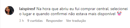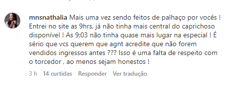 “Mais uma vez sendo feitos de palhaço por vocês! Entrei no site às 9h, já não tinha mais Central do Caprichoso disponível! Às 9h03, não tinha quase mais lugar na Especial! É sério que vocês querem que a gente acredite que não foram vendidos ingressos antes??? Isso é uma falta de respeito com o torcedor, ao menos sejam honestos!”, escreveu uma usuária no perfil do Instagram da empresa.