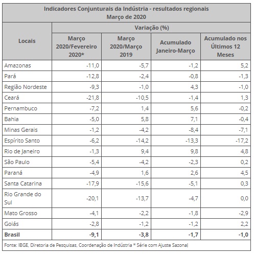 O resultado reflete as medidas de isolamento social imposto por estados e municípios desde meados de março, mês em que a Organização Mundial de Saúde (OMS) decretou a Covid-19 como pandemia, afetando o processo de produção em várias unidades do país.