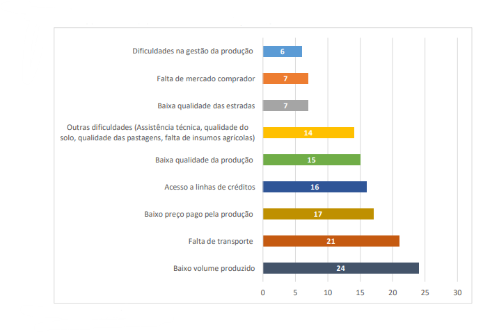 Outros desafios incluem falta de transporte, preços baixos, acesso limitado a crédito, baixa qualidade da produção, precariedade das vias de acesso, falta de mercado e carência de assistência técnica. Além disso, existem preocupações com a falta de equipamentos, infraestrutura inadequada e questões sanitárias no processamento da produção.