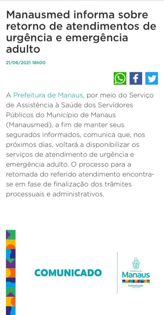 Mas no mesmo comunicado não é informado pela assessoria do órgão quando retomam e quais redes foram credenciadas pela Secretaria Municipal de Administração (Semad), órgão responsável pela Manausmed.