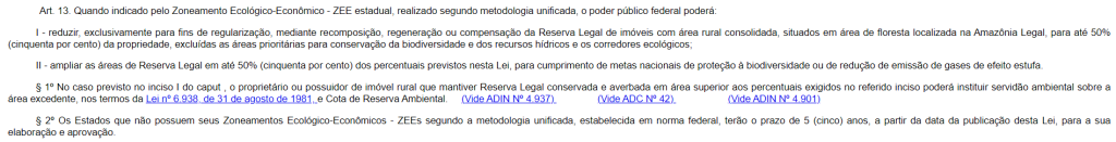 O Código Florestal determina que todo imóvel rural deve manter área com cobertura de 80% de vegetação nativa, no caso da Amazônia Legal, em áreas de florestas. Entretanto, a lei prevê que quando indicado pelo Zoneamento Ecológico-Econômico (ZEE estadual), o poder público federal pode reduzir essa área para 50% da propriedade, “em casos exclusivos para fins de regularização, mediante recomposição, regeneração ou compensação da Reserva Legal de imóveis com área rural consolidada, situados em área de floresta localizada na Amazônia Legal, com exceção das áreas prioritárias para conservação da biodiversidade e dos recursos hídricos e os corredores ecológicos”.