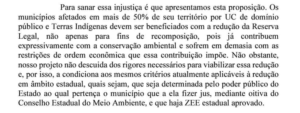 “Os municípios afetados em mais de 50% de seu território por UC de domínio público e Terras Indígenas devem ser beneficiados com a redução da Reserva Legal, não apenas para fins de recomposição, pois já contribuem expressivamente com a conservação ambiental e sofrem em demasia com as restrições de ordem econômica que essa contribuição impõe.“, aponta o trecho da PL.