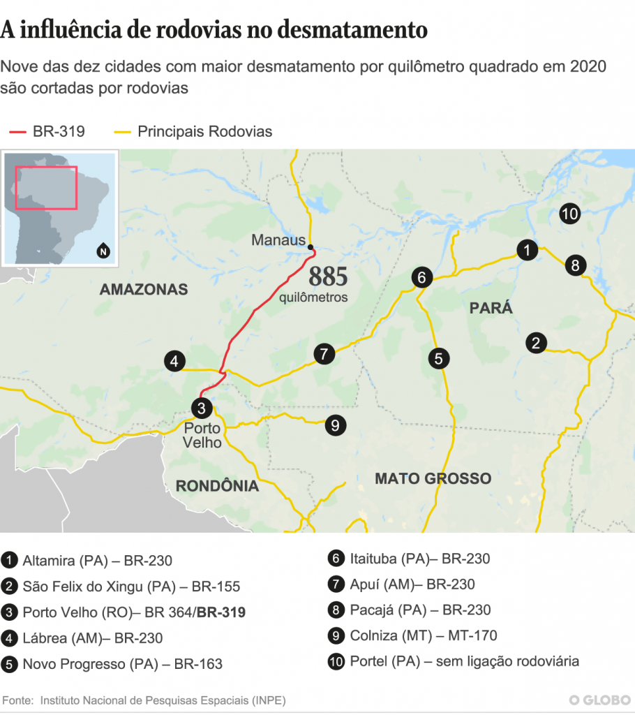 Dados de um estudo preliminar feito com imagens de satélites ao qual o Globo teve acesso mostram que, apenas em 2020, 410 quilômetros de estradas vicinais na região do entorno da rodovia foram abertos, para alarde de cientistas e ambientalistas. Os satélites também mostram que o desmatamento nos municípios cortados pela rodovia vem aumentando acima da média da Amazônia, que já está alta. Em julho, o governo anunciou a licitação para a pavimentação de um dos trechos da rodovia. A obra total está orçada em R$ 1,5 bilhão.