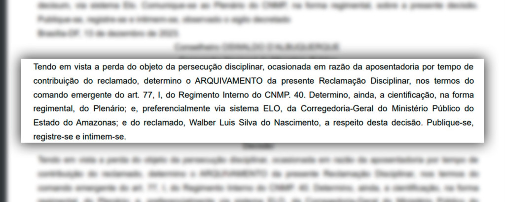 “Tendo em vista a perda do objeto da persecução disciplinar, ocasionada em razão da aposentadoria por tempo de contribuição do reclamado, determino o ARQUIVAMENTO da presente Reclamação Disciplinar, nos termos do comando emergente do art. 77, I, do Regimento Interno do CNMP. 40”, diz trecho da decisão.