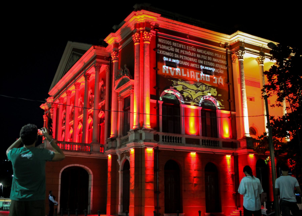 “Nossos recifes estão ameaçados pela exploração de petróleo na foz do Amazonas. Exigimos da Petrobras um estudo atualizado e integrado antes da perfuração. Avaliação já!” Estampa uma das projeções. Os cartazes pedem, principalmente, uma avaliação de impacto da área sedimentar.