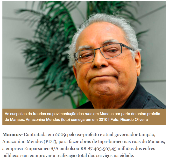 Contratada para fazer obras de tapa-buraco nas ruas de Manaus, a empresa Emparsanco S/A embolsou R$ 87.403.567,45 milhões dos cofres públicos sem comprovar a realização total dos serviços na cidade. Na época, vereadores de oposição denunciaram as suspeitas ao TCE e ao Ministério Público do Amazonas (MP-AM).