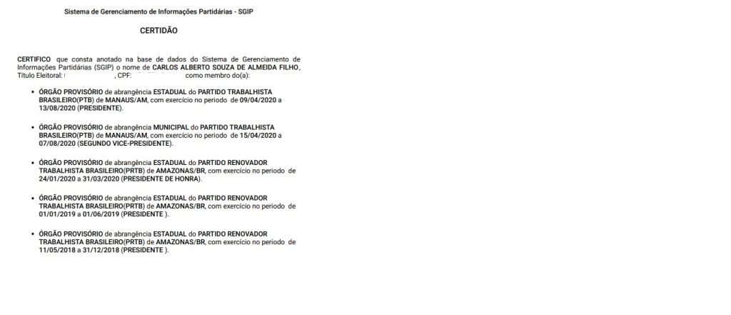Uma certidão emitida pela CENARIUM no Sistema de Gerenciamento de Informações Partidárias (SGIP) mostra apenas as movimentações de Almeida no Partido Trabalhista Brasileiro (PTB) e no Partido Renovador Trabalhista Brasileiro (PRTB), nos quais teve passagem até 2020. Após as saída das siglas, Carlos Almeida se filiou ao Partido da Social Democracia Brasileira (PSDB).