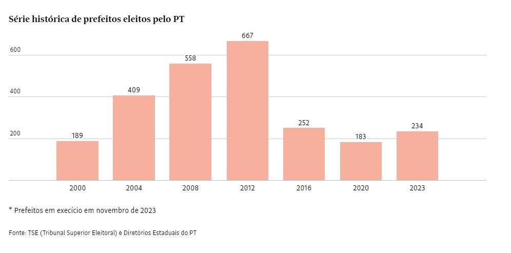 Com o vento a favor, o partido começa a deixar para trás o cenário adverso de 2020, quando saiu das urnas com 183 prefeitos, pior desempenho desde 1996. O auge do partido em uma eleição municipal foi em 2012, sob presidência de Dilma Rousseff, quando conquistou 644 prefeituras.