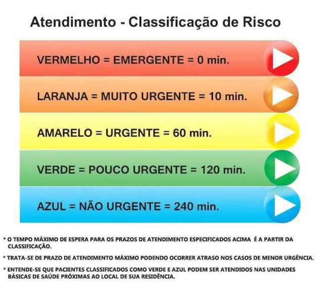 De acordo com informações do site do governo federal, a classificação de risco é utilizada no acolhimento hospitalar “para se fazer uma avaliação inicial do paciente e determinar a necessidade de um atendimento mais urgente“. O método permite verificar a gravidade do estado de saúde dos pacientes, potencial de risco e grau de sofrimento.