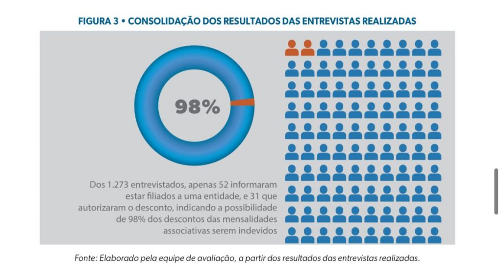 Das 1.273 entrevistas, 1.242 (97,6%) informaram não ter autorizado o desconto, e 1.221 afirmaram não participar de associação (95,9%), o que levantou a suspeita dos descontos estarem sendo feitos sem a autorização prévia dos beneficiários.