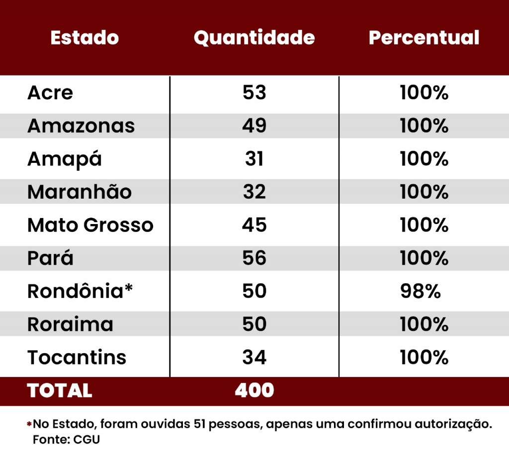 Dos 401 entrevistados nos Estados da Amazônia Legal, o maior número de pessoas ouvidas foi no Pará (56), seguido do Acre (53), Rondônia (51), Roraima (50), Amazonas (49), Tocantins (34), Maranhão (32) e Amapá (31). Apenas um entrevistado de Rondônia, entre os 51 abordados, confirmou autorização para o desconto, o que corresponde a 98% da amostra. Nos demais estados, 100% das pessoas ouvidas negaram ter autorizado os descontos.