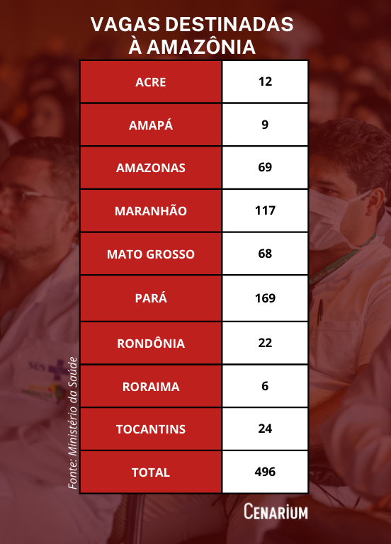 Para o Estado do Pará, foram destinadas 169 vagas, seguido do Maranhão, com 117 profissionais a serem selecionados. O Amazonas vem em terceiro, com 69. Depois está o Mato Grosso (68), Tocantins (24) e Rondônia (22). Os entes da região com menor número de vagas são Acre (12), Amapá (9) e Roraima (6).