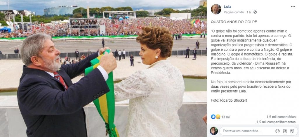 O ex-presidente Luís Inácio Lula da Silva também se manifestou sobre a data memorável, citando a frase célebre de Dilma em 2016.