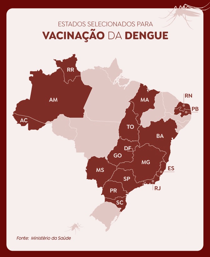 A vacinação vai chegar às cinco regiões do Brasil. No Norte, serão quatro Estados: Acre, Amazonas, Roraima e Tocantins, totalizando 47 municípios incluindo as capitais. A escolha das cidades teve como critério alta incidência da doença em 2023 e neste mês de 2024 e municípios com mais de 100 mil habitantes.