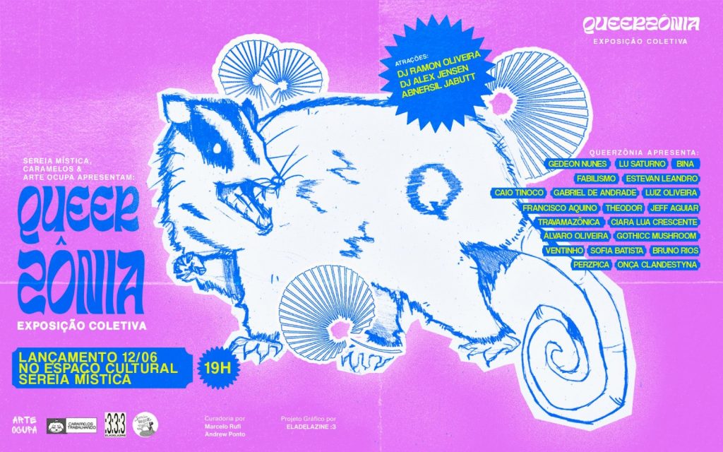 A identidade visual da exposição toma como símbolo a mucura, o gambá amazônico, animal marginalizado que se transforma aqui em ícone de resistência, ambiguidade e reinvenção queer. A mucura, frequentemente associada ao lixo, ao cheiro e à escuridão, é ressignificada como metáfora viva da dissidência: um ser que, mesmo desprezado, sobrevive, transita e desafia normas. É essa a essência da QUEERZÔNIA: não caber, mas ferver.