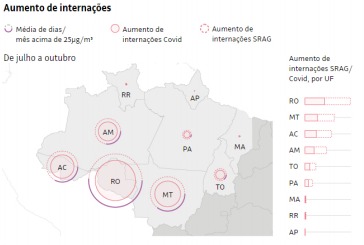 A cada dia em que os finíssimos grãos de material particulado ficaram em suspensão na atmosfera acima do patamar considerado seguro pela OMS (Organização Mundial de Saúde), o risco de uma pessoa contaminada pelo novo coronavírus ser internada subia 2%. A fumaça das queimadas esteve relacionada a um aumento de 18% nos casos graves de Covid (aqueles em que houve internações hospitalares) e de 24% em internações por síndromes respiratórias nos cinco Estados com mais fogo da Amazônia durante as queimadas de 2020 (Amazonas, Acre, Rondônia, Mato Grosso e Pará).