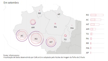 Os moradores de Rondônia foram os que mais sofreram. Durante toda a temporada de queimadas, o Estado teve o maior aumento de internações relacionadas à fumaça das queimadas. Em setembro, pior mês do ano, os dados mostram quase 26 dias com altos índices de poluição. Nesse contexto, a população viveu com 66% mais de chances de dar entrada no hospital por complicações da Covid-19, indica o estudo exclusivo do InfoAmazonia.