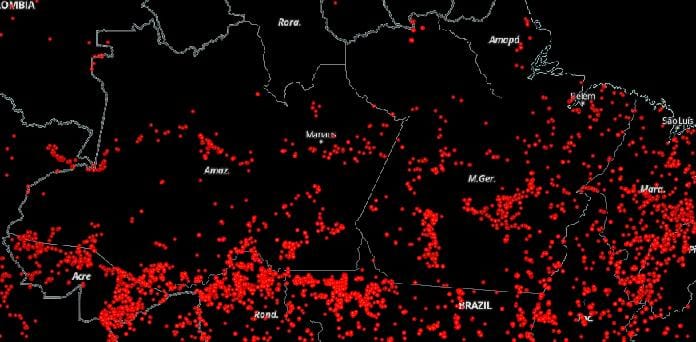 MANAUS – Por meio de um satélite da Agência Espacial Americana (Nasa) que orbita nas proximidades da Amazônia, é possível monitorar simultaneamente os focos de incêndio na região. Uma leitura realizada neste domingo, 16, mostra as áreas tomadas pelas chamas.