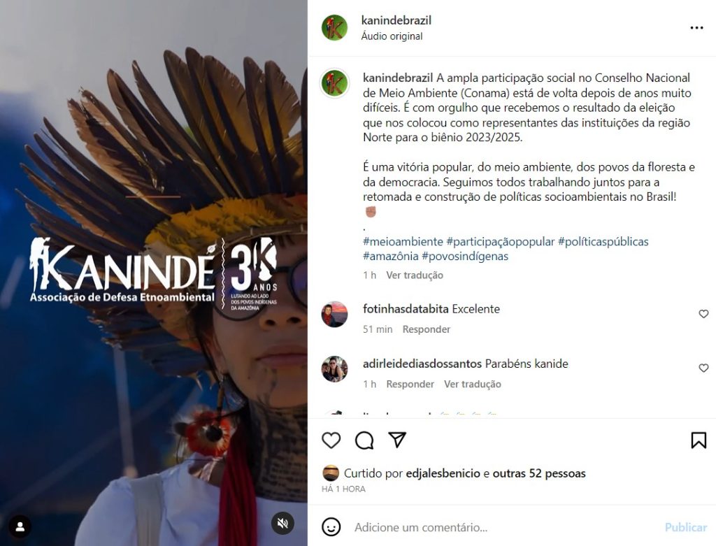 “A ampla participação social no Conselho Nacional de Meio Ambiente está de volta depois de anos muito difíceis. É com orgulho que recebemos o resultado da eleição que nos colocou como representantes das instituições da Região Norte para o biênio 2023/2025”, afirmou a Associação Kanindé.
