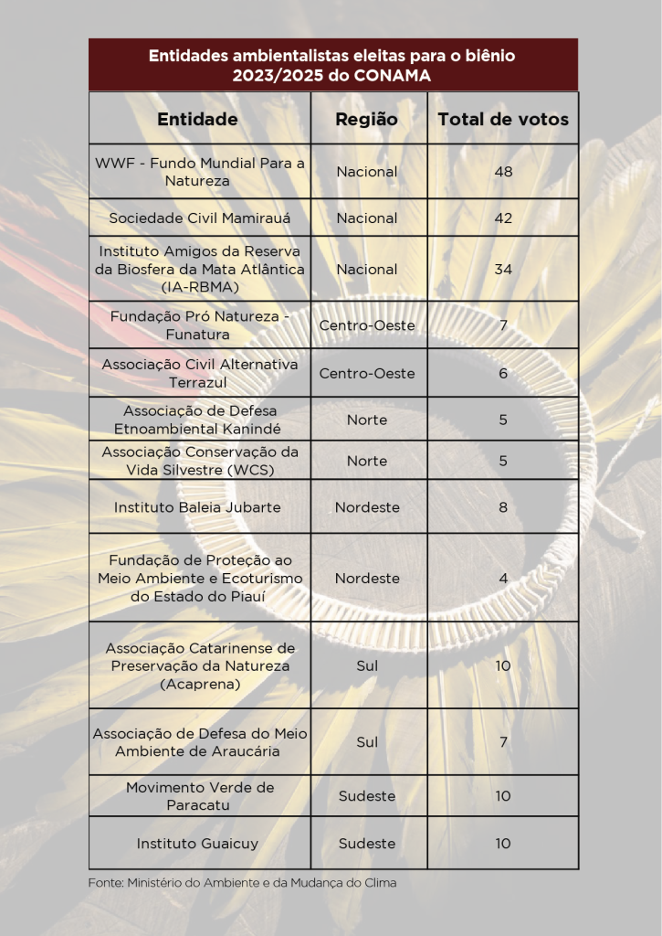 Ao todo, 47 entidades de todas as regiões brasileiras concorrem às vagas do Conama, em 2023, e 13 foram eleitas. WWF Brasil, Sociedade Civil Mamirauá e o Instituto Amigos da Reserva da Biosfera da Mata Atlântica (IA-RBMA) foram escolhidas como entidades de representação nacional.