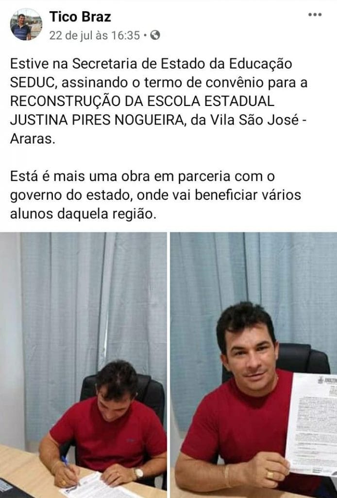 “O presente convênio tem por objetivo a execução de obras e serviços de engenharia consistente em: reconstrução da Escola Estadual Justina Pires Nogueira, localizada à Rua Couto Vale, nº 1035, na Comunidade São José Araras”, diz trecho da cláusula primeira do convênio.
