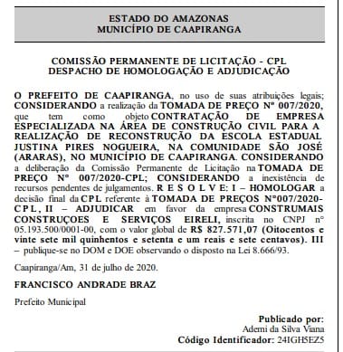 De acordo com o documento, a empresa foi vencedora de licitação por meio da Tomada de Preços nº 007/2020. Apesar de possuir o despacho de homologação e adjudicação, o documento no entanto, não informa quando as obras devem ser iniciadas e nem a vigência do contrato.