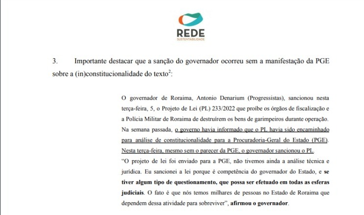 O documento destaca que a sanção do governador de Roraima ocorreu sem a manifestação da Procuradoria-Geral do Estado sobre a inconstitucionalidade do texto. “Na semana passada, o governo havia informado que o PL havia sido encaminhado para análise de constitucionalidade para a Procuradoria-Geral do Estado. Nesta terça-feira, mesmo sem o parecer da PGE, o governador sancionou o PL”, afirma trecho da ADI.