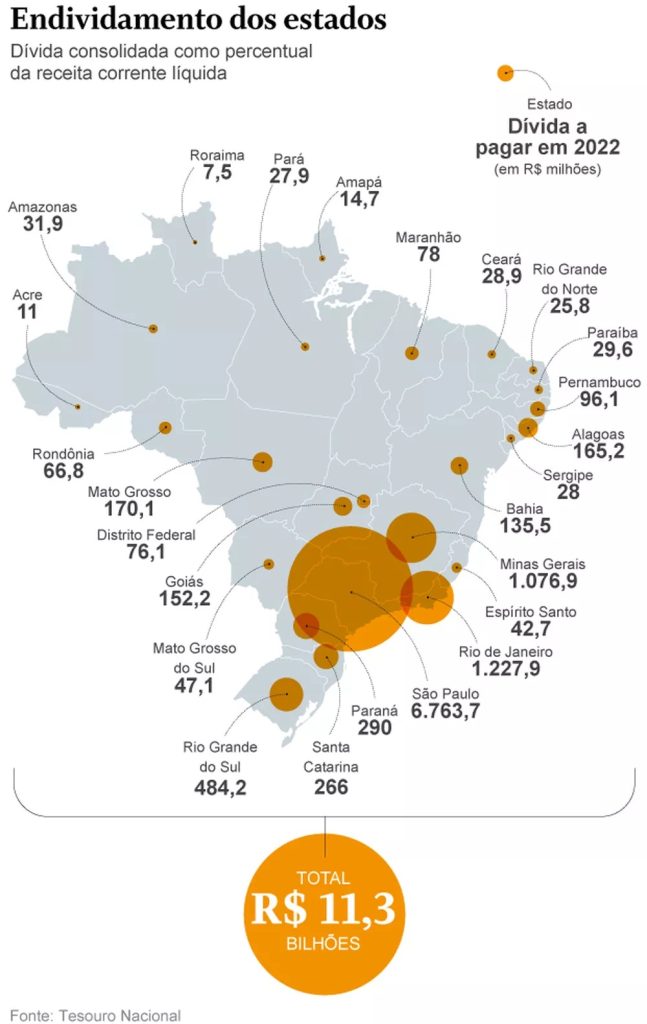Os Etados pedem ao Supremo a suspensão do pagamento de suas dívidas junto à União, como forma de compensar a queda de arrecadação com o tributo. No total, eles têm R$ 11,3 bilhões a pagar neste ano ao governo federal, de acordo com levantamento feito pelo Tesouro Nacional.