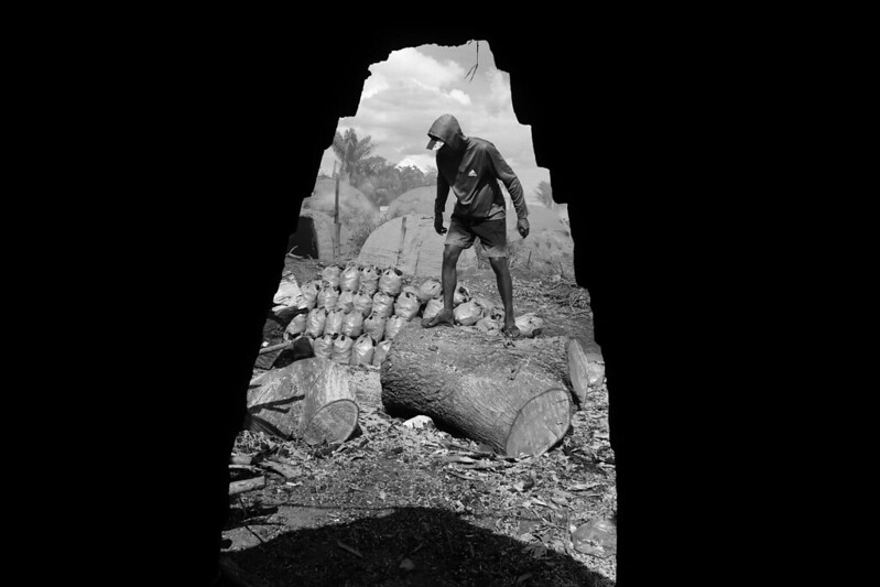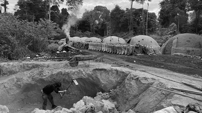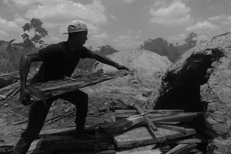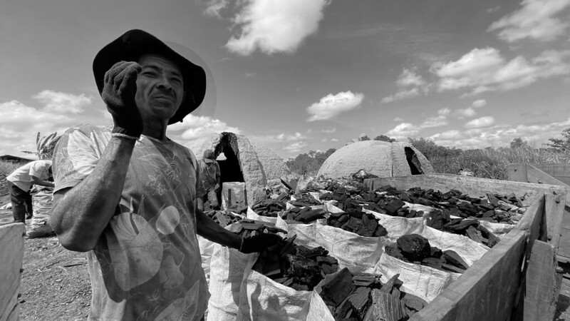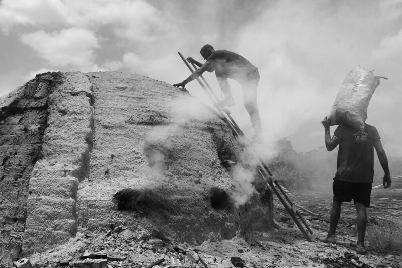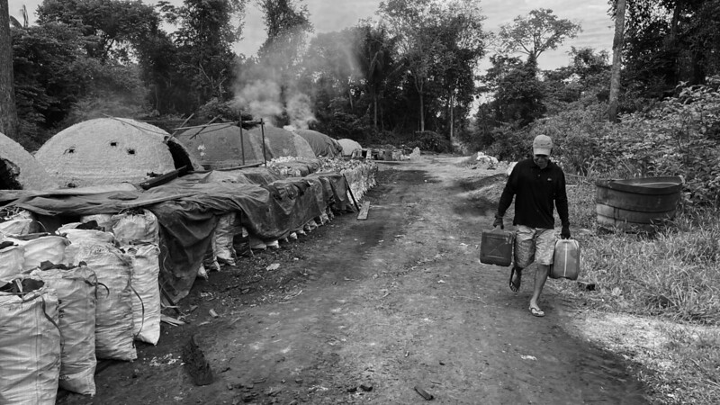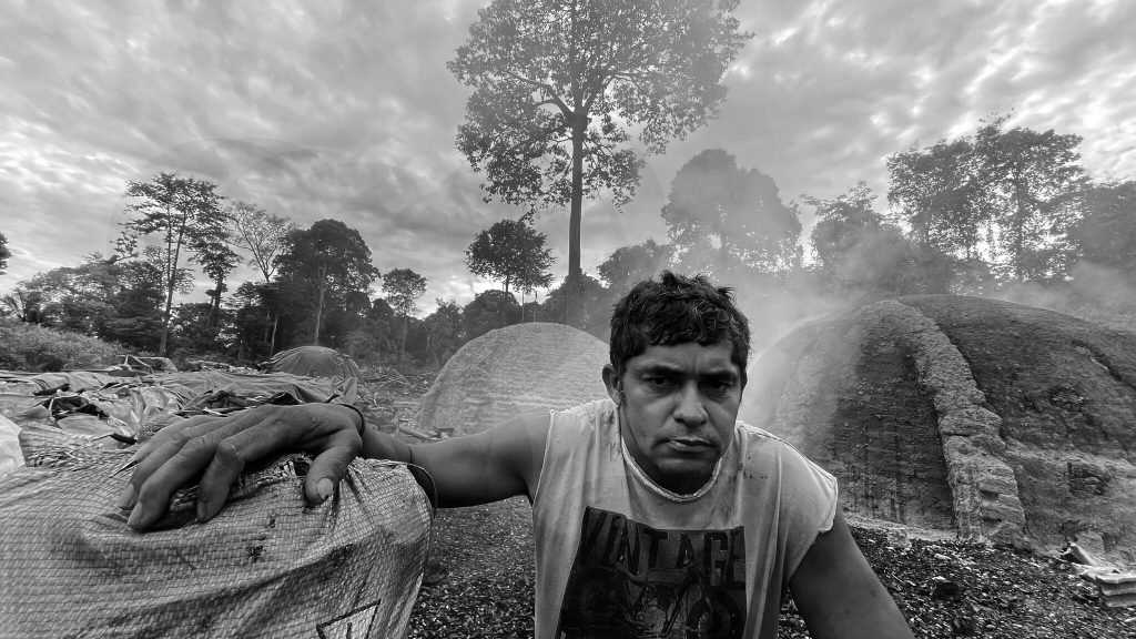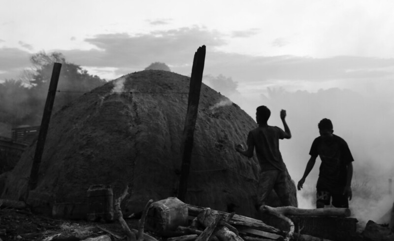 Ao fundo da madeireira, um caminho de terra batida leva a um sinal de fumaça branca. Carvoeiros checam os fornos em que as toras de madeira ardem até ficarem carbonizadas. A produção de carvão faz parte de uma cadeia de exploração de terras, que passa pelo desmatamento para a criação de gado, soja ou garimpo, onde, após esgotados os recursos, o que sobra é uma carvoaria.