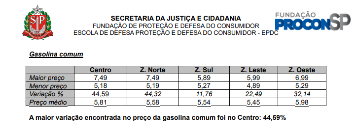 O levantamento é da Fundação de Proteção e Defesa do Consumidor (Procon-SP), que levantou o preço final da gasolina comum em 50 postos distribuídos nas cinco regiões da cidade no período de 26 a 27 de fevereiro.