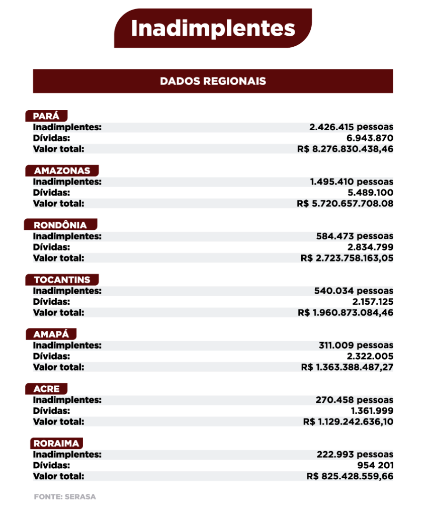 São quase 4 milhões de pessoas com dívidas no Pará e Amazonas, Estados mais populosos da região. Já Acre e Roraima concentram o menor número de pessoas com dívidas pendentes: juntos, ambos registram quase 500 mil pessoas.