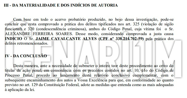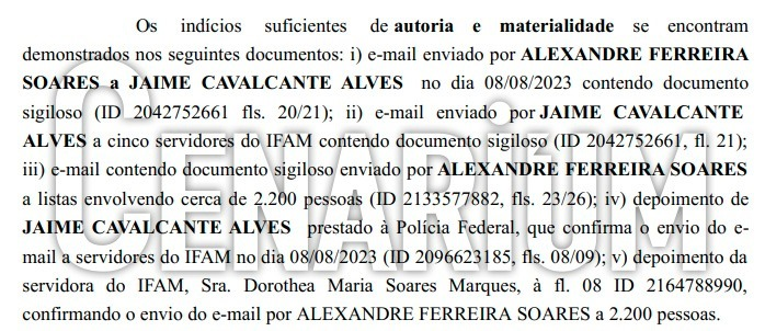 “Os indícios suficientes de autoria e materialidade se encontram demonstrados nos seguintes documentos: i) e-mail enviado pelo psicólogo a Jaime Cavalcante no dia 08/08/2023 contendo documento sigiloso; ii) e-mail enviado por Jaime Cavalcante a cinco servidores do Ifam contendo documento sigiloso; iii) […] iv) depoimento de Jaime Cavalcante prestado à Polícia Federal, que confirma o envio do e- mail a servidores do IFAM no dia 08/08/2023”, diz trecho do documento. Veja: