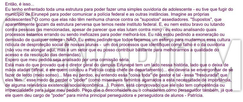 O e-mail foi enviado inicialmente ao endereço jaime.ifam.com.br e outros sete destinatários às 15h13 de 8 de agosto de 2023. Na mensagem ao reitor, o então psicólogo da instituição pede remoção de Eirunepé (AM) para Manaus após ações de combate a assédio sexual na instituição elevar a tensão entre ele e os docentes da unidade. Na carta a Jaime Cavalcante, o servidor cita “ameaça de morte institucional” feita pelo professor do instituto federal, Marco Aurélio Anadam Mello.